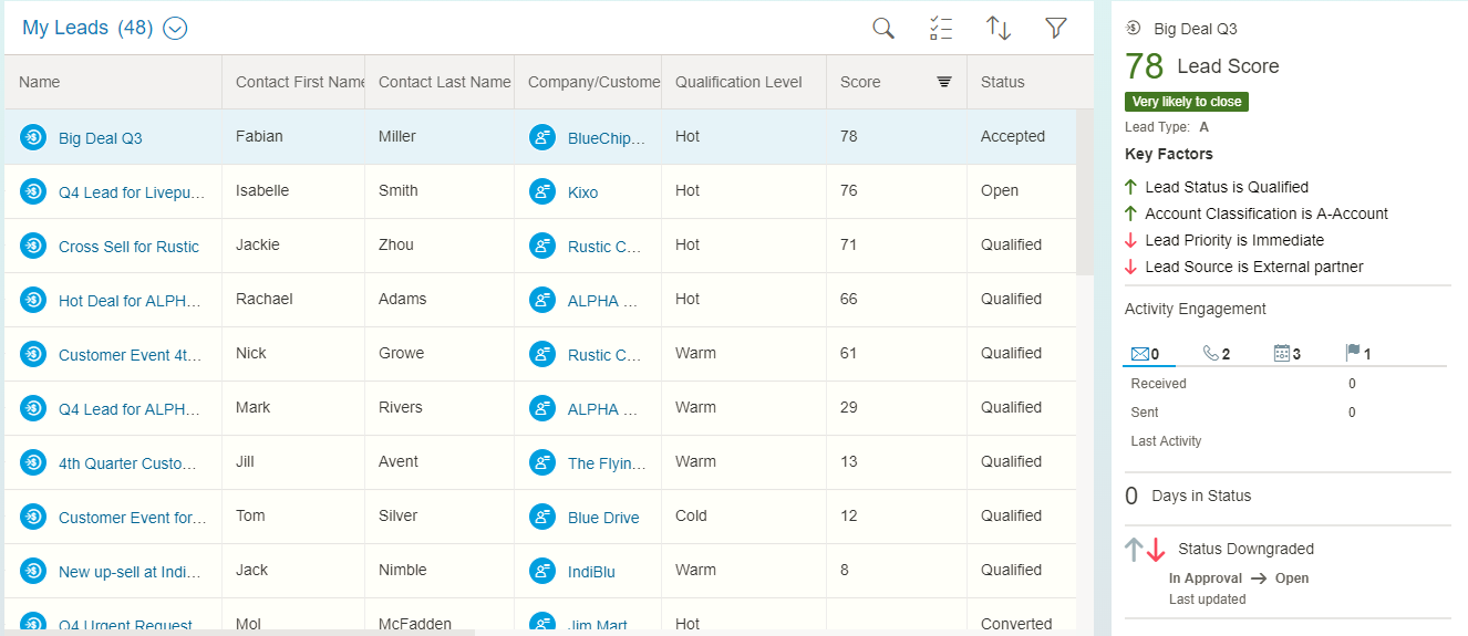 Sind diese drei großen Blöcke also klar definiert und dazu mit einem System an Scores hinterlegt, kommt man mit der Zeit und einer funktionierenden Lead- & Demand-Generation in Kombination mit Lead-Nurturing zu einer kontinuierlich gefüllten Pipeline an warmen, freundlichen und kaufwilligen Prospects – sogenannten Sales Qualified Leads, die mit ICPs (mehr dazu in unserem Blogbeitrag der nächsten Woche) angereichert und abgeglichen an das CRM automatisiert übergeben werden. Hier kann der zugeordnete Vertriebsmanager übernehmen und hat alle Informationen zu dem Lead auf einen Blick: